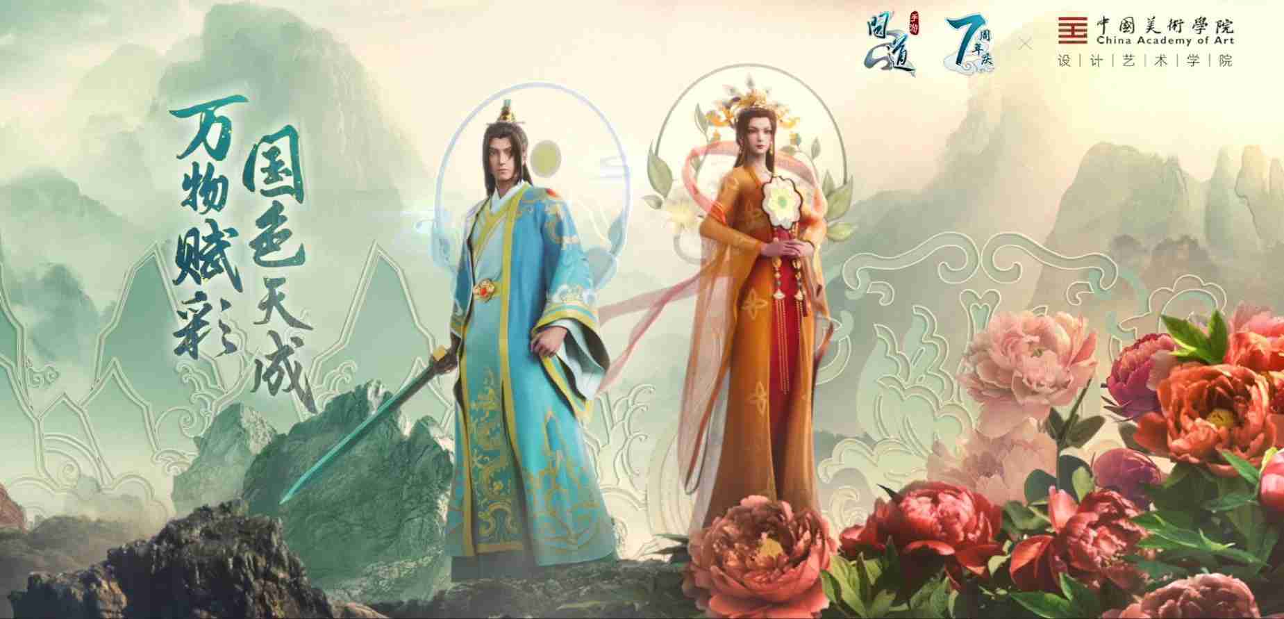 2023年4月,,,,《问道手游》联动中国美术学院,,,在游戏中融合了中国历史上不同时期的文化元素,,打造了“山河万象”与“凤鸣九霄”的国风时装。。在色彩配置方面,,,创作团队基于对游戏角色特性的分析提取相应的文化内涵,,,,从每一种色彩的色相、、、指代事物和情感出发对应角色属性,,选定服装的色彩搭配。。。在纹样设计方面,,,创作团队结合游戏角色自身特殊的造型比例和形态,,,,在实际的纹样设计中进行了游戏语境下的活化演绎。。男性角色集中使用了如蟒纹、、、、海水江崖纹、、如意纹和云气纹等传统纹样元素,,女性角色则吸纳了凤凰纹、、、牡丹纹、、卷草缠枝纹等元素,,,,组成以“双凤牡丹纹样”“缠枝牡丹纹”“金玉凤冠头饰”为主要纹样的游戏角色装饰图案系统。。。